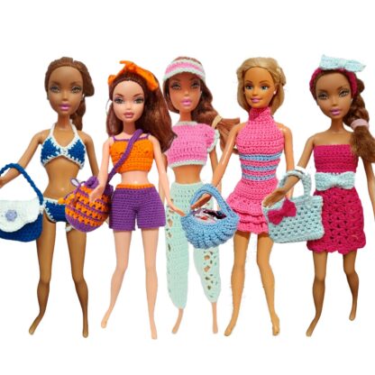 Este exclusivo combo incluye cinco (5) encantadores conjuntos de verano tejidos completamente a mano, pensados para renovar el vestuario de tu muñeca con looks variados, cómodos y llenos de encanto artesanal.