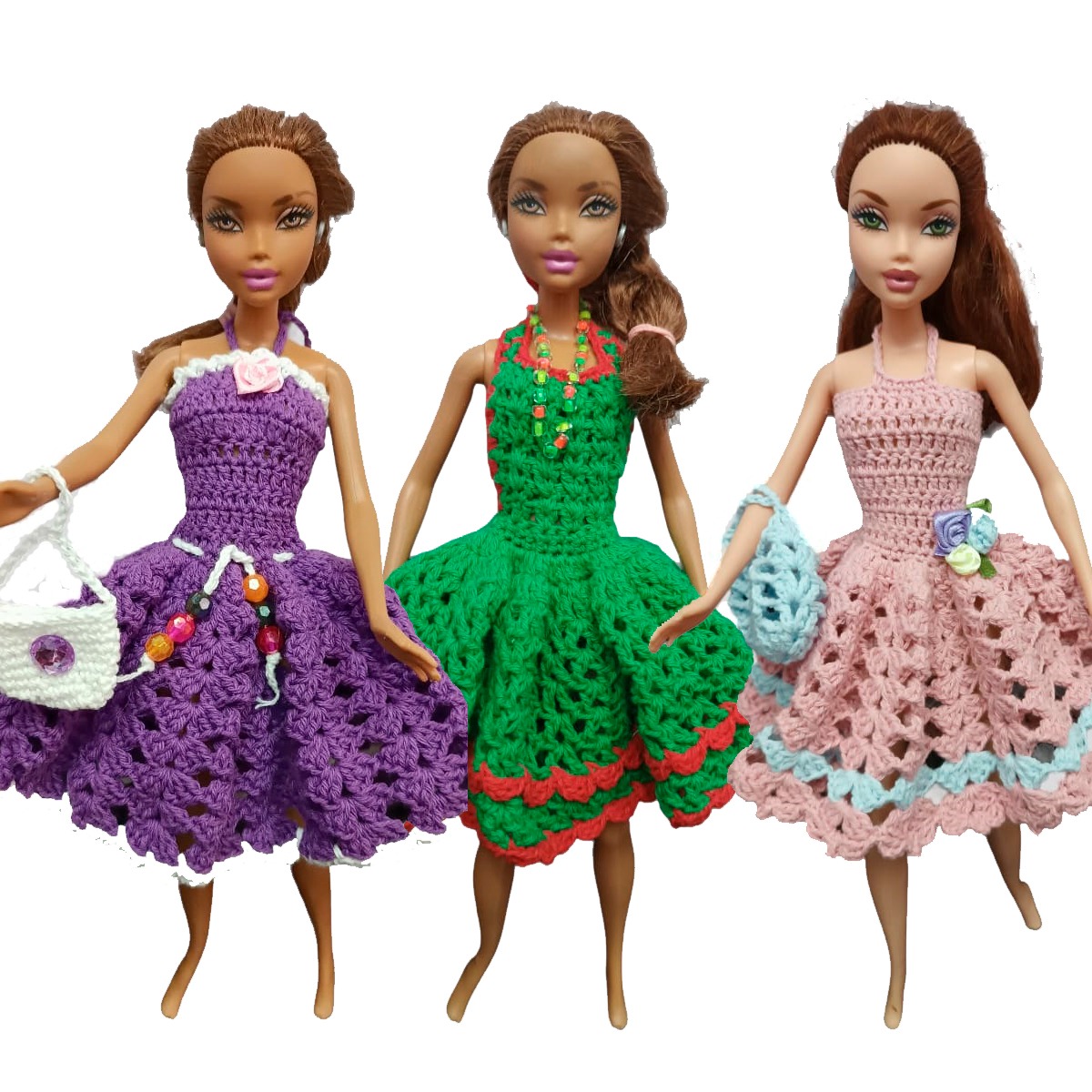 Este exclusivo combo incluye tres (3) encantadores vestidos tejidos completamente a mano, pensados para renovar el vestuario de tu muñeca con looks variados, cómodos y llenos de encanto artesanal.