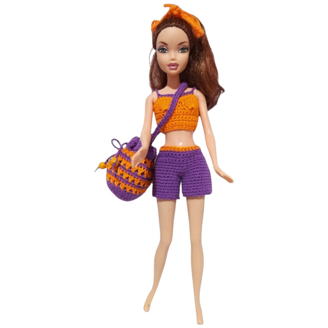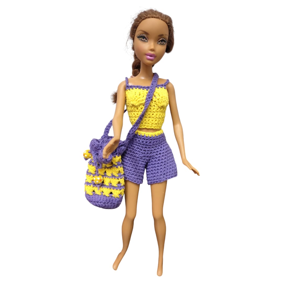 Incluye un top tejido, un short con detalles decorativos y un bolsito  tejido que completa el outfit y suma un toque divertido y práctico. Cada pieza está realizada con dedicación, cuidando las terminaciones y los pequeños detalles que hacen único a cada conjunto.