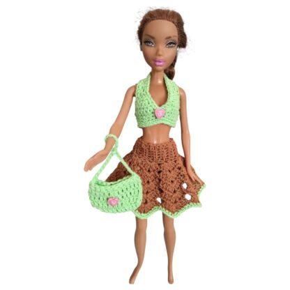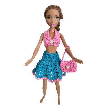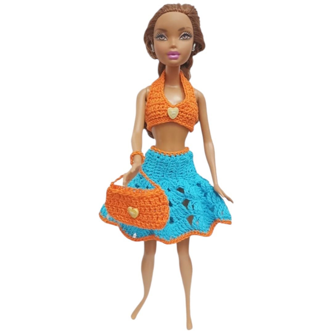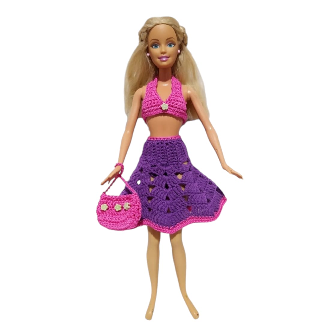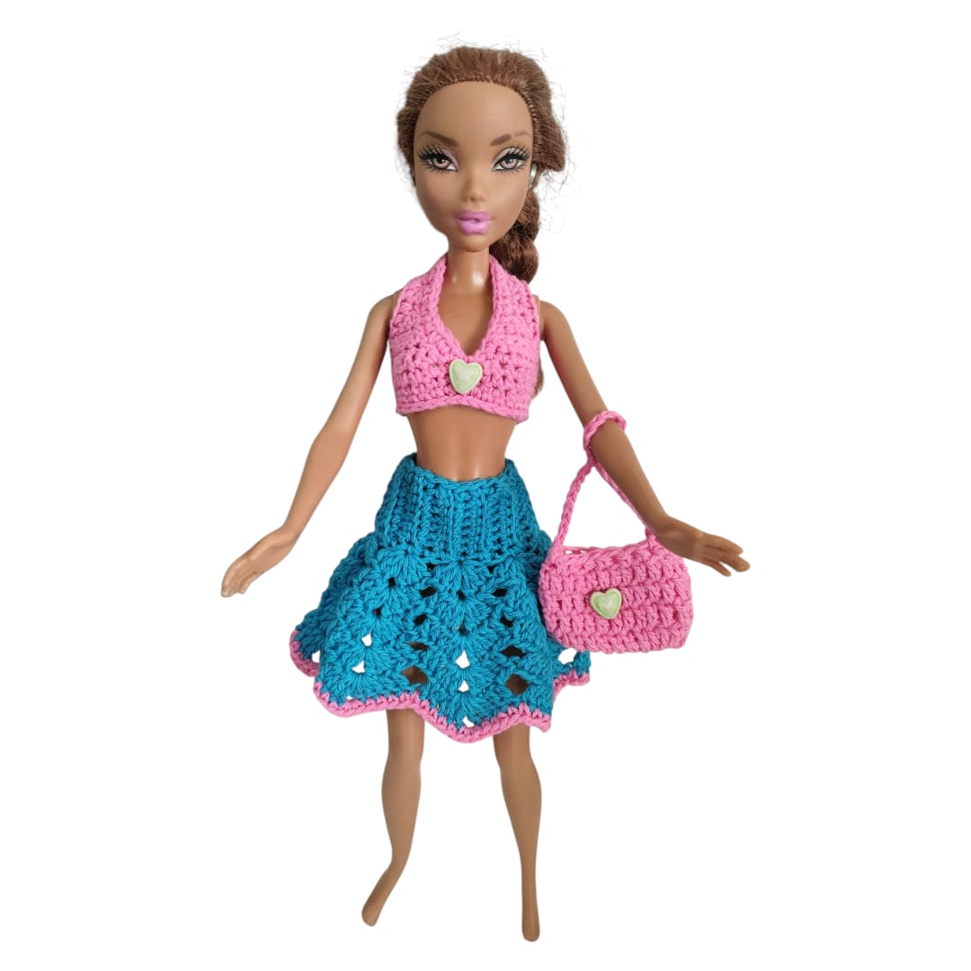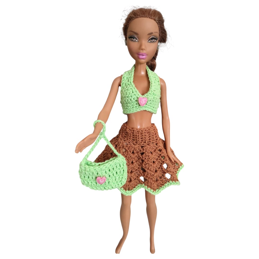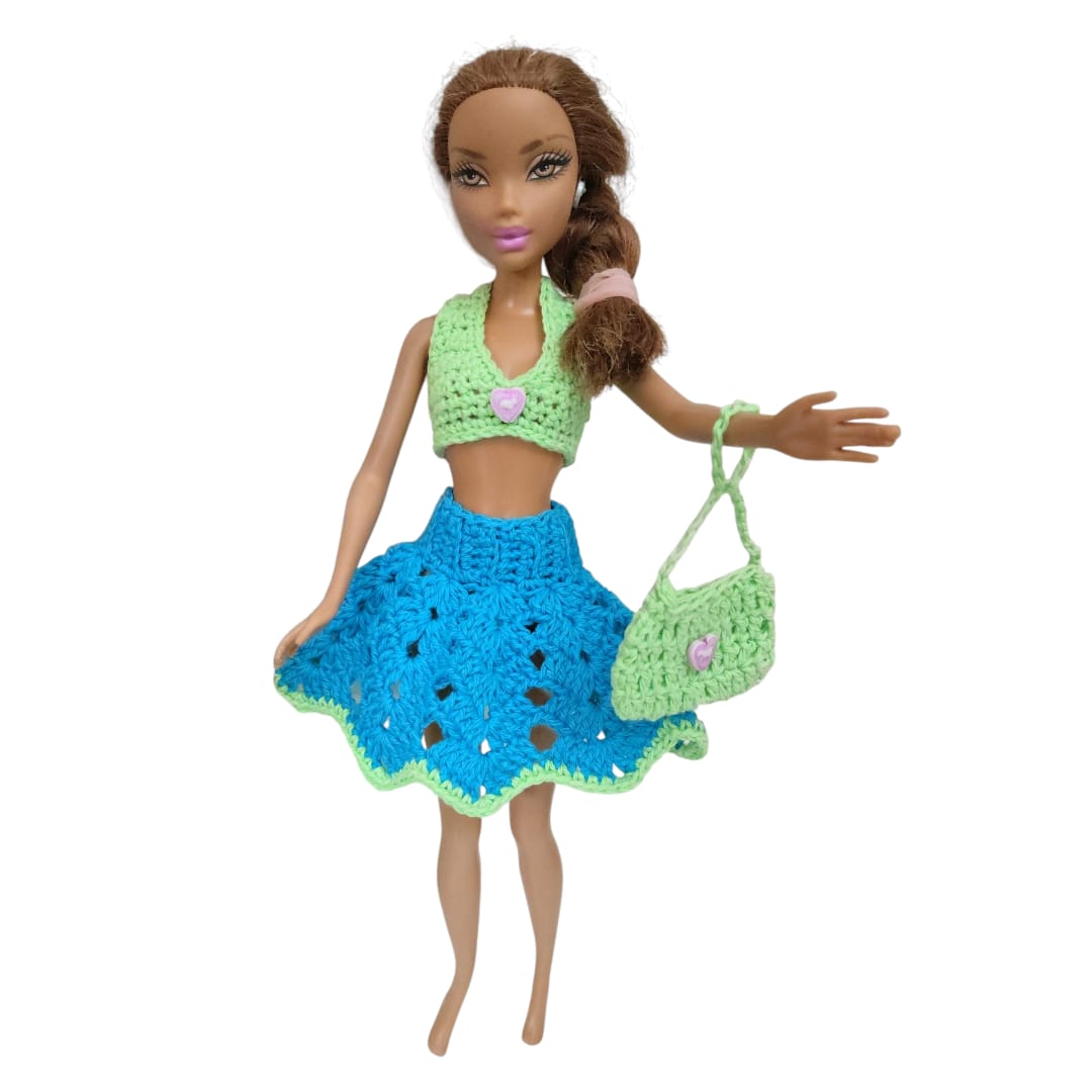 Incluye un top tejido, una pollerita  y una carterita tejida que completa el outfit y suma un toque divertido y práctico. Cada pieza está realizada con dedicación, cuidando las terminaciones y los pequeños detalles que hacen único a cada conjunto.