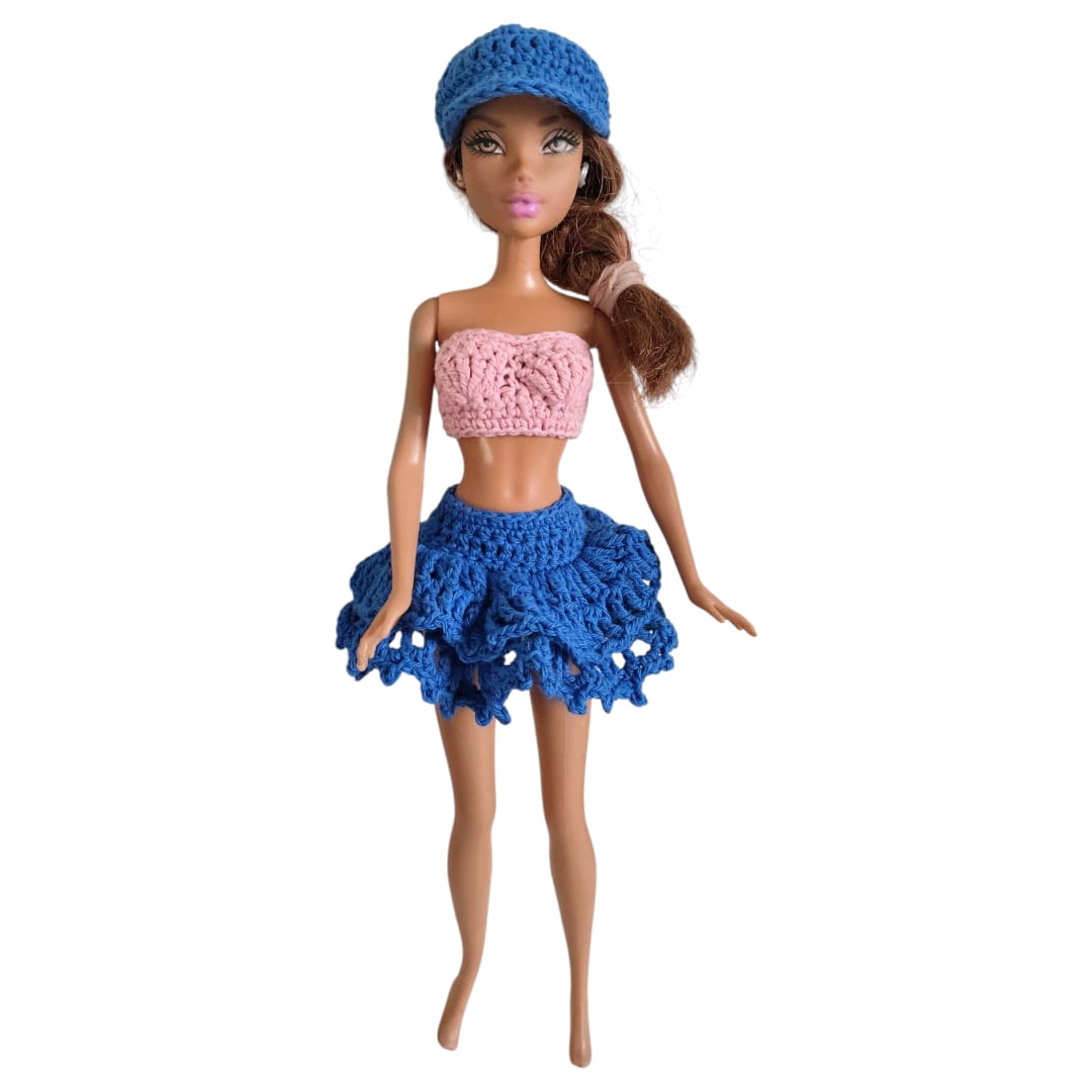 Este delicado conjunto tejido a mano combina sencillez y estilo en un diseño fresco y actual. Cada pieza está confeccionada cuidadosamente, resaltando el encanto del trabajo artesanal en miniatura y logrando un look juvenil y encantador para tu muñeca.